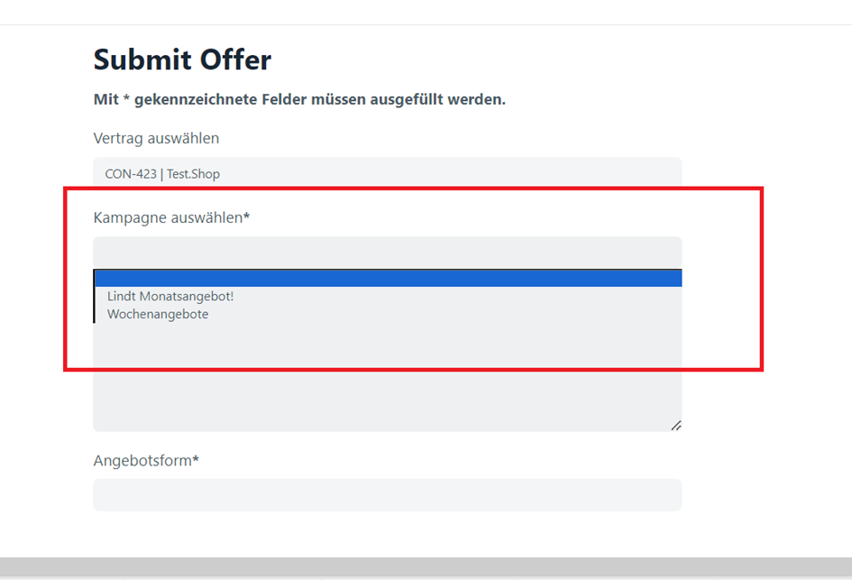Menüpunkt 3 „Offers“: Übermitteln von Angeboten Bei Auswahl von „Offers“ wird die folgende Eingabemaske angezeigt. Mit * gekennzeichnete Felder sind Pflichtfelder.
