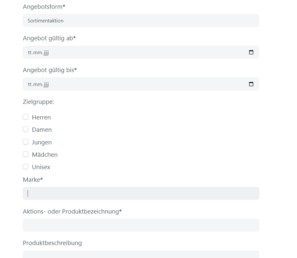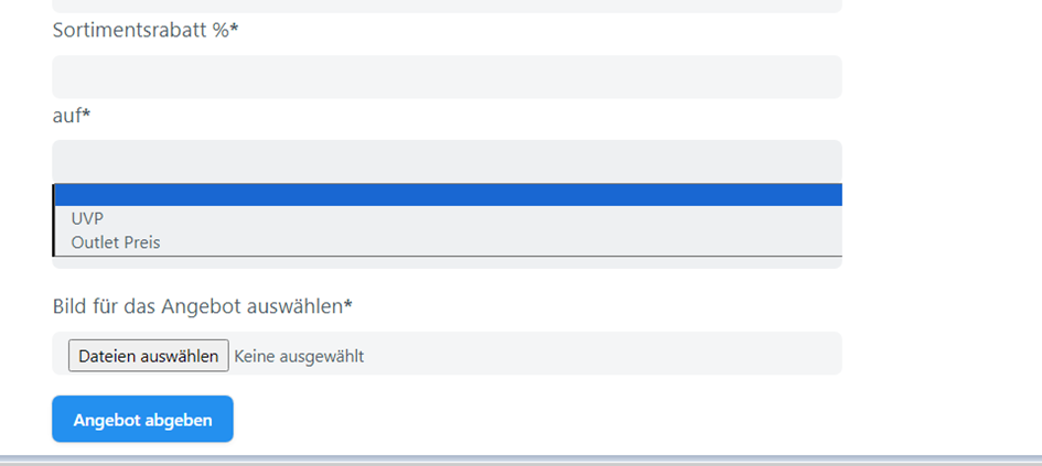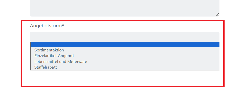* Bei der Angebotsform Staffelrabatt ist das Feld Rabattbeschreibung auszufüllen (z.B 3 Artikel kaufen 2 zahlen“)