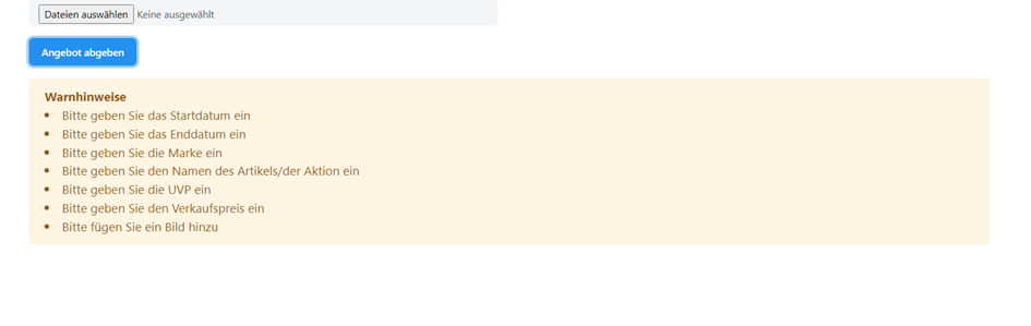 Sollten die Angaben in Ihrem Angebot nicht vollständig sein oder Fehler beinhalten, wird Ihr Angebot nicht abgegeben und es werden unterhalb des Knopfes "Angebot abgeben" Warnhinweise eingeblendet