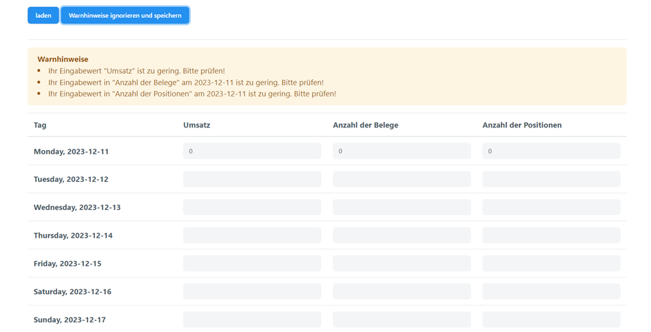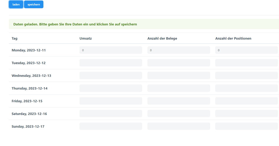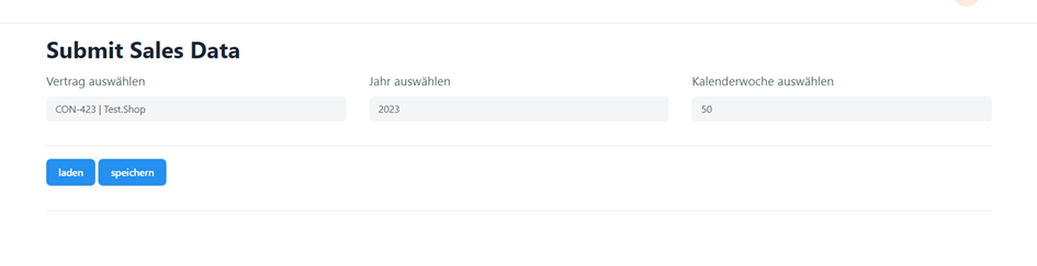 Menüpunkt 2 „Sales Data“ dient der Eingabe Ihrer Verkaufsdaten. Voreingestellt ist Ihr Vertrag, das aktuelle Jahr und die aktuelle Kalenderwoche. Falls Sie über mehrere Verträge verfügen, stehen alle Ihre Verträge zur Auswahl Um die Daten eingeben zu können drücken Sie auf die Schaltfläche „laden“. Unterhalb wird Ihnen eine Eingabe-Tabelle zur Verfügung gestellt. Hier müssen Sie Ihre Verkaufszahlen für die jeweiligen Tage eintragen. Bitte geben Sie Ihre Verkaufszahlen sorgfältig ein. Überprüfen sie diese anschließend. Drücken Sie dann auf „speichern“. Beim Speichern werden Ihre Eingaben einer Plausibilitätsprüfung unterzogen. Hier kann es zur Ausgabe von Warnhinweisen kommen. Bitte beachten Sie diese Hinweise und prüfen dann die angegebenen Zahlen noch einmal. Nach der Prüfung speichern sie die (ggf. korrigierten) Zahlen.